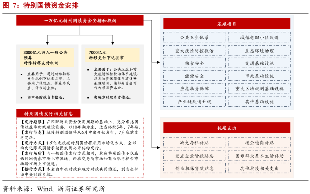 财政分项支出预算公布,教育、社保就业、卫生健康等是全年重点支出领域,凸显短期应对疫情、落实“六保”,长期兼顾保障基本民生的政策基调。下半年财政资金运用关注三大方面,首先,预算内资金根据预算安排,教育、科技支出、文旅体传、节能环保等领域的财政支出将进一步增加,同时社保就业、交通运输仍是重点支出领域。其次,特别国债7月底发行完毕,直达地方县市,重点支持基建项目和抗疫相关支出,基建涉及12大方向,抗疫支出则布局6个方面。第三,专项债加速发行,资金充裕,将对下半年政府性基金支出形成积极正向支持,带动形成有效投资。
