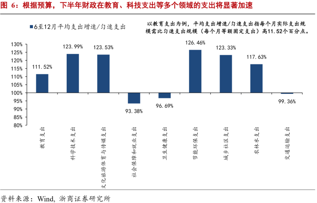 根据我们测算,下半年,一般公共预算支出和政府性基金预算支出有望分别超过匀速序时支出(每个月支出固定规模)9个和28个百分点,财政支出速度显著提升。