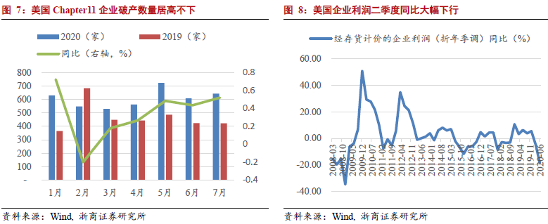 总量层面来看,美国8月失业率降至8.4%,新增非农就业人数137.1万人持续修复。总量改善的背后是就业质量的恶化,增量就业全部由临时工返岗所贡献、永久性失业人数大幅跃升说明疫情对美国经济造成的结构性伤害正在增加。恶化的主要原因在于8月8日美国PPP政策到期后未能及时接续,财政刺激方案悬而未决对经济的不良后果正在逐渐显现。除此之外,投资、破产等多项数据指向企业景气度不足也说明在当前疫情仍未退散的过渡阶段,美国经济对进一步刺激政策存在客观需求。