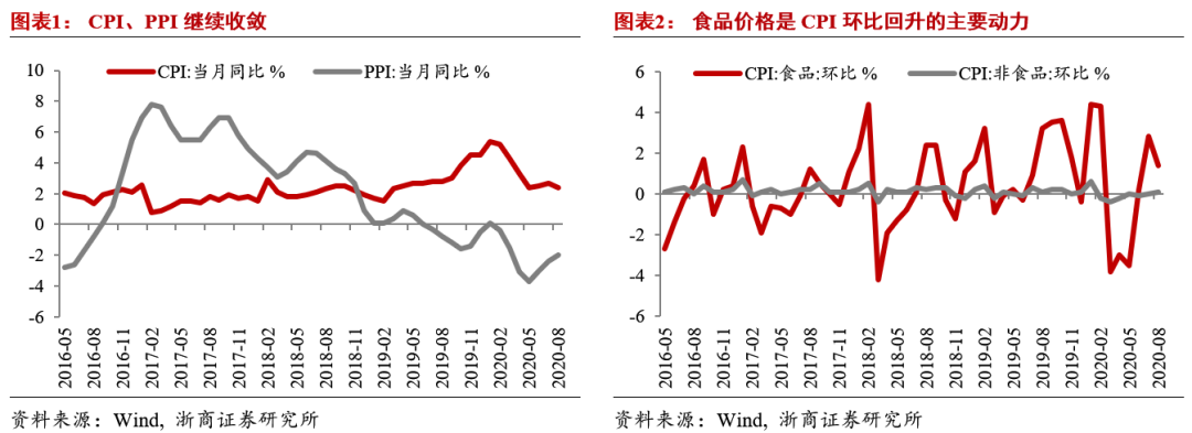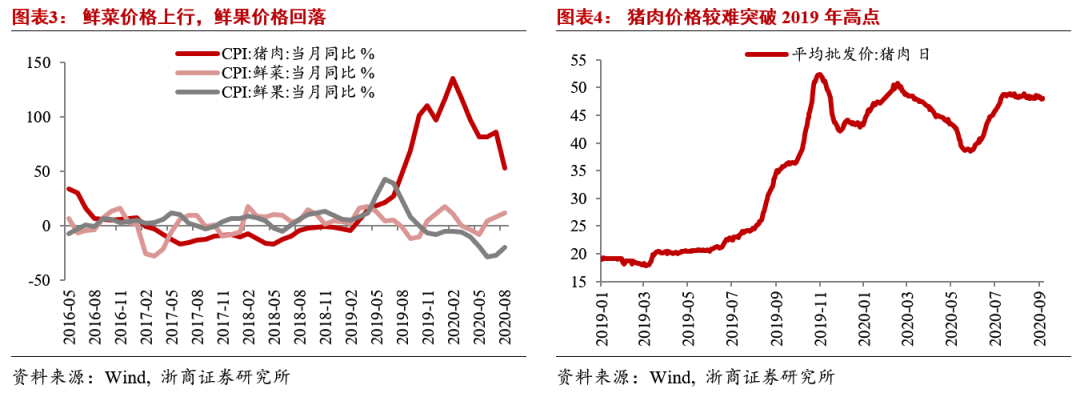 8月CPI环比+0.4%、同比+2.4%(前值+2.7%),环比回升、同比下降。其中,食品价格环比+1.4%,依然是CPI环比上行的主要动力,鲜菜、蛋类价格上涨幅度较大。鲜菜主要受强降雨天气和汛情影响,供给收缩、运输受阻导致价格持续上涨;鸡蛋一方面由于蛋鸡存栏量较低、供给偏紧,另一方面中秋是鸡蛋需求旺季,8月蛋价大幅度修复;非食品价格环比+0.1%,其中主要受益于线下消费复苏、假期旅行出游热度上升,飞机票和宾馆住宿价格有所提振,未来食品与非食品端的分化表现有望收敛。2019年“猪周期”加速上行发生在8月之后,因此猪价高基数对于今年9月之后的CPI影响更大,未来CPI同比下行趋势的不变。