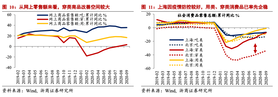 随着经济逐步回归合理增长区间,居民收入渐进修复,2020年Q3社会消费品零售总额单季增速转正至+0.9%,最终消费支出拉动GDP增长1.7个百分点,消费开始呈现出加速修复的特征。随着投资的逆周期拉动作用趋弱,消费将成为经济进一步改善的主要动力。
