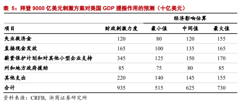 一是对符合条件的居民一次性发放1400美元,叠加此前600美元可能使Q1居民可支配收入同比增速上至20%。二是将此前方案中每周额外的失业金由300美元提升至400美元,并将期限延长至9月末。三是向州政府拨款3500亿美元。四是投入700亿美元用于病毒防治。该项方案最终实际落地规模仍存不确定性。