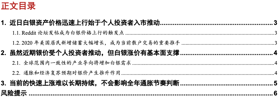本轮白银价格上行源于个人投资者入市推动叠加基本面自有逻辑(经济复苏+通胀预期),当前不宜低估个人投资者的购买力量,存量储蓄对资产价格的潜在推升能力不可小视。短期内白银仍可能快速上行,但难以长期持续。最晚可能在Q1末伴随“再通胀交易”的转向而告一段落,不影响我们对全年通胀节奏的判断。