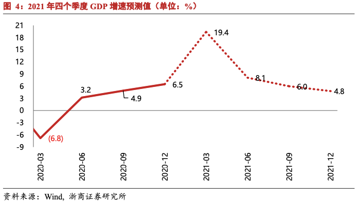 《报告》对今年GDP增速设定目标为6%以上,重新设置GDP增速目标符合我们去年11月初策略报告《大国博弈与跨周期调节》中的判断。维持对2021年全年GDP实际同比增速8.9%的预测,实现全年目标值难度不大。趋势上,预计四个季度GDP增速分别为19.4%、8.1%、6%、4.8%,四季度随着经济增速回落甚至跌破全年目标值,就业也可能受到明显拖累,则仍会触发政策宽松。