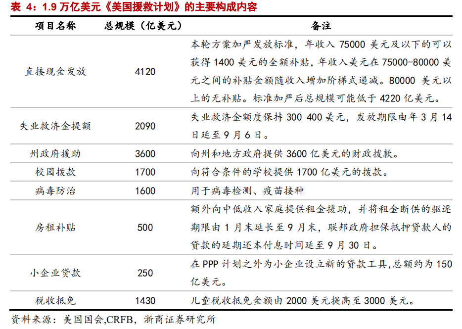 综上,拜登的系列计划最早需等至2021年10月方可启动立法流程,实际落地可能需2022年。在此背景下,二季度将是2021年美国财政刺激红利的集中释放期,下半年起财政红利将逐渐退潮。本轮财政刺激方案中的最核心措施是居民一次性现金发放,额度共计4120亿美元,目前已拨付3250亿美元,拨付比例约79%,剩余近1000亿资金规模预计将于4月陆续拨付到位。此外,失业救济金、地方政府补助、疫苗注射以及核酸检测拨款、学校复学拨款等政策将根据实际需要陆续划转到用款账户。