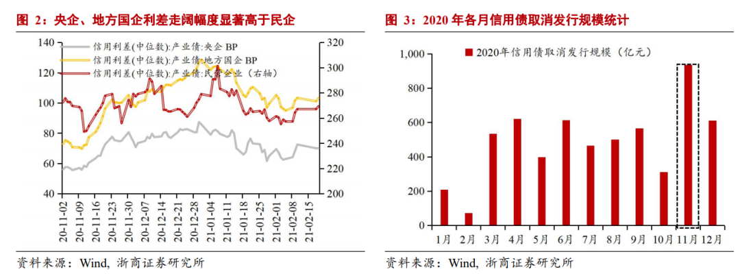 企业债券融资较易出现非线性的收缩,2020年11月信用债违约风波使得信用债市场信心受挫,央企和国企的信用利差显著走阔,企业债券融资大幅回落。2020年11月10日,主体评级为AAA的永煤控股发布公告称,因流动资金紧张,未能按期兑付超短融券“20永煤SCP003”到期应付本息,已构成实质性违约。在传统信用分析框架下,永煤控股作为河南省重点工业企业,市场普遍认为其应该具备债务偿还能力,投资者也对AAA评级国企信用债持有较强的刚兑信仰,因此永煤违约事件的发生超出市场预期,导致信用债市场信心受挫,恐慌情绪逐渐向其他信用债横向蔓延,不仅导致二级市场煤炭、钢铁等周期类行业的信用债评级被下调、价格下跌,也引发金融机构抵押品资质要求提高,使得非违约弱资质的信用债遭遇市场抛售,信用利差持续走阔,Wind的统计数据显示,11月9日至12月31日,民企利差走阔10bp,而央企和地方国企利差分别走阔29bp与58bp。随着永煤违约事件的持续发酵,市场上的风险偏好大幅回落,二级市场的违约事件的负面影响也向一级市场传导,扰动了一级市场信用债发行,部分机构调整信用债质押入库名单,甚至对所有的信用品种采取“一刀切”的态度,导致信用债流动性受限,信用债融资大幅度回落,11月第二周,信用债净融资随即转负,11月全月,信用债取消发行规模升至936亿元,环比增长201%。