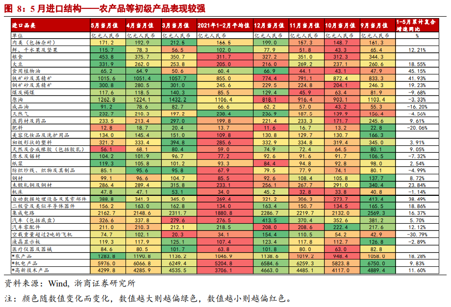 5月人民币计进口同比39.5%,前值增32.2%,一定程度上超市场预期,与我们预测的34%较为接近。受疫情冲击影响,2020年5月我国进口同比为-12.7%,低基数有正贡献,助力5月进口高增。剔除基础效应,5月进口两年复合增速10.61%,凸显出进口的强势表现。我们自2021年初以来持续提示关注决定进口逻辑的变化,即从“海外供给”向“内需拉动”切换,目前来看随着海外供给的修复和内需阶段性的韧性,进口高增的预判已经兑现,我们预计5、6月将是全年进口同比高点,下半年内需的渐进回落决定了进口增速稳步下台阶。