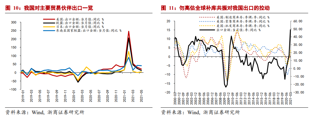 下半年我国出口大概率边际走弱。一方面,疫苗大范围注射并产生实质性影响,即便疫情反复对供需的扰动也显著下降,海外供给快速修复将导致我国暂时性替代效应走弱,出口大概率渐进下行。另一方面,我们预计本轮全球补库共振较弱,对我国出口的拉动作用有限,原因在于,其一,没有强投资拉动难有强补库。疫情后的全球地产景气热度逐步回落,美国地产的阶段性强势已经初步显露疲态,基建刺激计划短期难有效果,且面临诸多挑战,没有全球大规模有效投资需求支撑,补库幅度有限。其二,没有强资本开支难有强补库。海外经济体企业资产负债表修复较慢,未来可能面临政策滑坡产生的二次冲击,整体资本开支相对有限,没有强资本开支补库上行持续性有限。