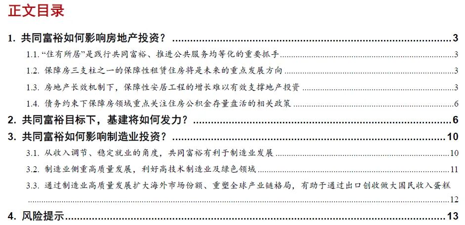 共同富裕将带来增量固定资产投资,对于基建投资,其一是发力弥合区域、城乡等方面的发展差距,其二是推进公共服务均等化的实现,发挥基建补短板;共同富裕背景下政府发挥主导作用的保障性安居工程的增长难以有效支撑地产投资,在稳定宏观杠杆率的整体背景下,保障房领域未来超预期的部分应重点关注住房公积金存量盘活的相关政策;制造业方面,制造业高质量发展将促进就业扩容提质,共同富裕有助于制造业投资持续发展;制造业扩大海外市场份额、重塑全球产业链格局,也有助于通过出口创收做大国民收入蛋糕。