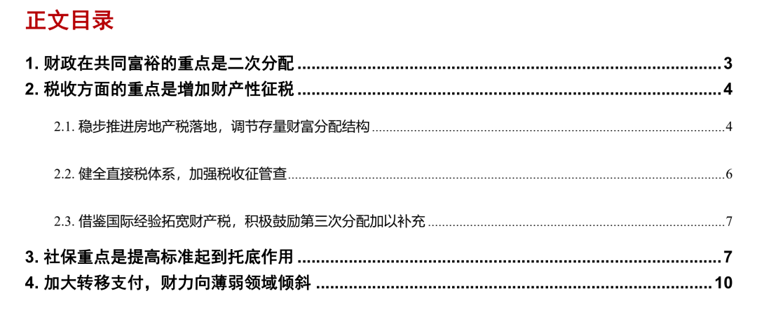 财政政策如何服务于共同富裕目标?——(1)促进共同富裕,财政政策重点推进二次分配。(2)发挥财税手段调节再分配,重点关注财产性征税,稳步推进房地产税落地,调节存量财富差距,可适时推进资本利得税、遗产税等征收拓宽财产税范畴。(3)健全社会保障、提升社保标准可起到托底作用。(4)加大并完善转移支付体系,财力向薄弱领域倾斜,有助于弥合差距。