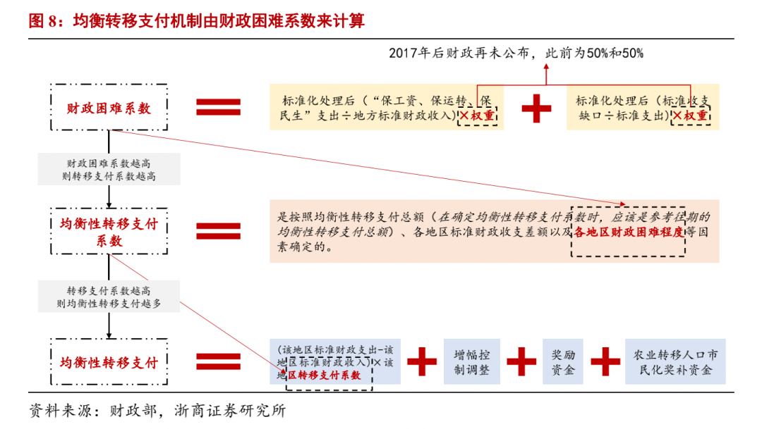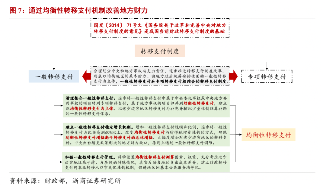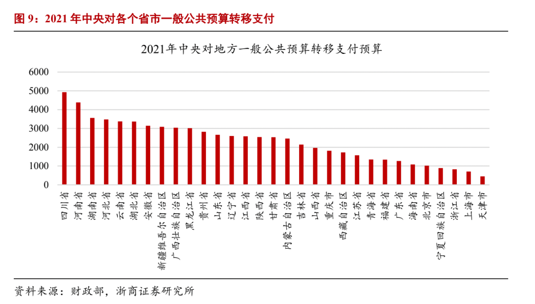 结合十四五规划要求的“优化转移支付机制、加大对财力薄弱地区的支持”,我们认为,为进一步弥合区域间发展不平衡的问题,可以进一步提升转移支付规模及均衡性转移支付占比,特别是对中西部地区加强财力支持,从而完善地区间支出差异成本体系,增强基层的公共服务保障能力。