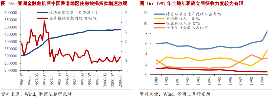 1997年中国香港地区房地产市场泡沫破裂主要受亚洲金融危机影响所致,香港金管局在联系汇率制下的持续加息以及资本流出压力导致房地产市场承压。中国香港地区房产税推出时间较早,物业税和差饷税早在1940和1845年便已开始征收,推行时并未对房地产市场产生明显打压;1997年中国香港地区确立土地年租,也是对当时已有的土地批租制度的完善和补充,对地产泡沫破裂影响有限。我们认为中国香港地区房地产市场泡沫的破裂主要受亚洲金融危机影响所致,与征收房产税无关。