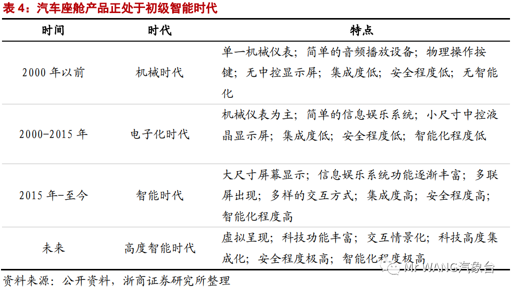 智能座舱是从消费者应用场景出发构建的人机交互体系,从汽车座舱升级路径来看,座舱产品正处于初级智能时代,全液晶仪表开始逐步替代传统仪表,少数车型新增HUD抬头显示、流媒体后视镜等,人机交互方式多样化,智能化程度明显提升。但现阶段大部分座舱产品仍是分布式离散控制,即操作系统互相独立,核心技术体现为模块化、集成化设计。智能座舱产品多元化,提升单车价值量。传统座舱产品以机械仪表和车载音视频播放器为主,整体单车配套价值在2000元以下,而智能座舱产品丰富,融合触控、智能语音、视觉识别、智能显示等实现多模态交互,整体单车配套价值大幅提升。
