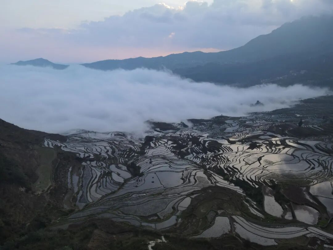 清晨,在元阳多依树梯田景区,许多游客天不亮就赶到这里等待日出。只见在早晨的雾气中,新年的第一缕阳光在延绵起伏的梯田尽头若隐若现。当太阳悄悄从厚雾中出现,天光云影,水色斑斓,勾勒着早晨最耀眼的瞬间,一幅光影与大地描绘的新生画卷在人们眼前舒展。