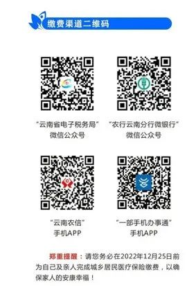 特别提醒:城乡居民基本养老保险原有的银行代扣方式已经停用,您可通过“云南省电子税务局”微信公众号、农业银行手机银行APP、一部手机办事通APP、云南农信手机银行APP等线上完成个人缴费,如需开具纸质缴费票据,可自行到元阳县税务局办税大厅服务窗口打印。