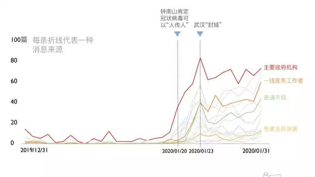 在媒体分析部分,我们参考了《2286篇肺炎报道观察:谁在新闻里发声》的采样标准,抽取的样本涵盖国内主要的19家媒体,具体包括5家中央机关媒体(新华社、人民日报、中国青年报、中国新闻周刊、健康报)、6家全国性市场化媒体(财新、界面新闻、澎湃新闻、三联生活周刊、人物、第一财经)、2家垂直领域权威自媒体(丁香园、八点健闻),以及武汉、广州、北京三地的3家地方机关媒体(长江日报、广州日报、北京青年报)和3家地方都市媒体(楚天都市报、南方都市报、新京报)。抽样的时间范围为2019年12月31日至2020年2月7日。