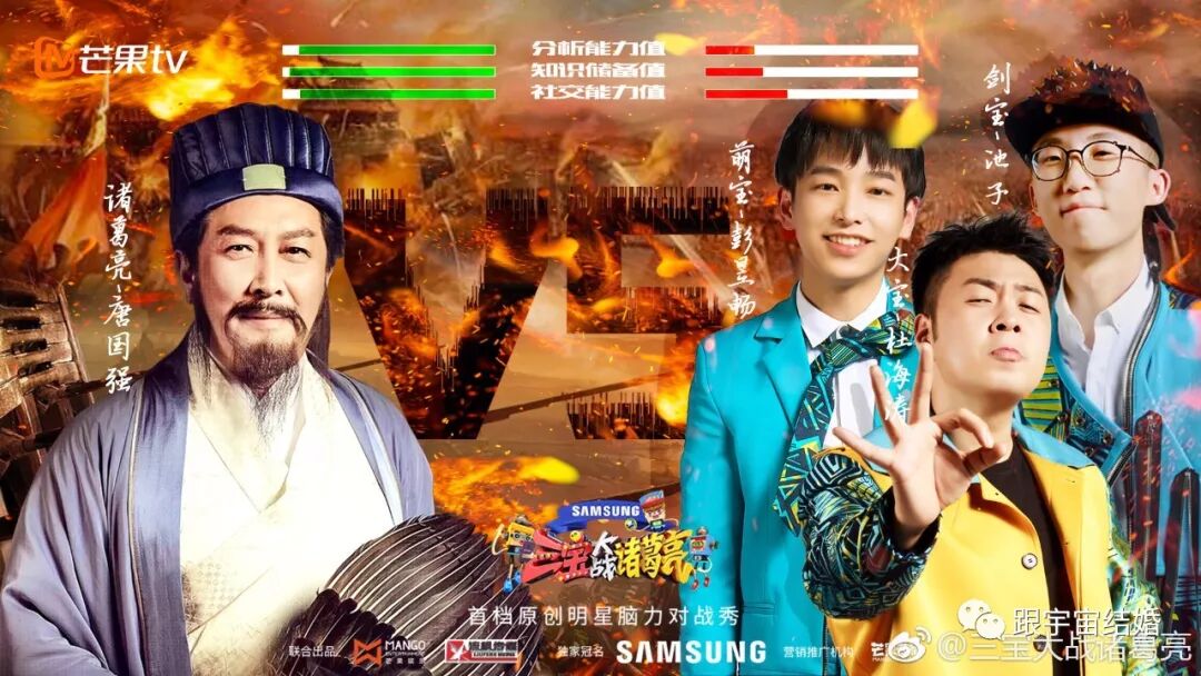 4月22日起每周日中午12点芒果TV全网独播的首档原创明星脑力对战秀《三宝大战诸葛亮》。这档以“三个臭皮匠杠过诸葛亮”为口号的节目,由杜海涛、池子、彭昱畅组成三宝军团,每期与一位知识大神“诸葛亮”展开脑力对决。相比于以往的知识类竞答综艺,这档节目最大的特点在于竞答模式和内容上的创新。