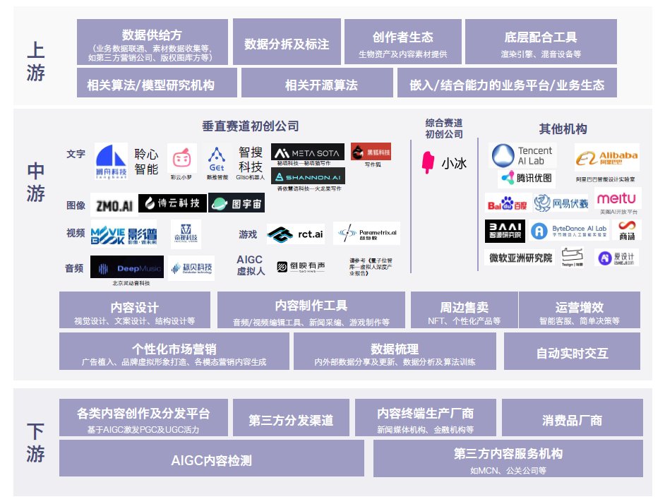 AIGC产业的上中游。根据量子位的梳理,可以把AIGC产业分为上游(数据供给方、开源算法社区、创造者生态层等)——中游(文字、图像、音频、视频等垂直赛道)——下游(应用场景和终端客户)。
