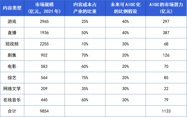 我们按照内容市场的规模、内容制作成本的比重、有多少比重的内容可被AIGC化来做假设,可以简单估算出AIGC对存量内容产业改造的市场潜力至少是千亿级别。