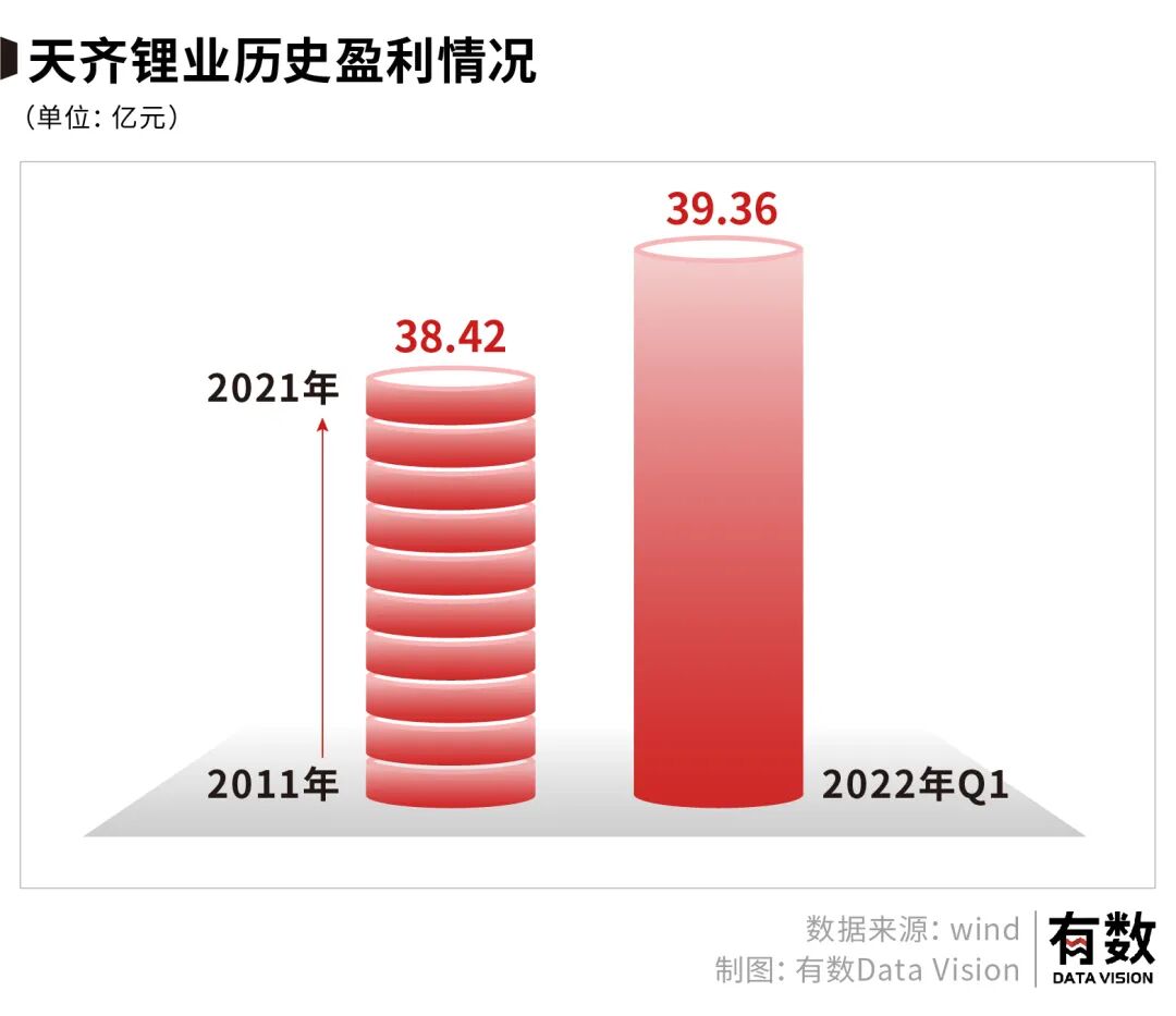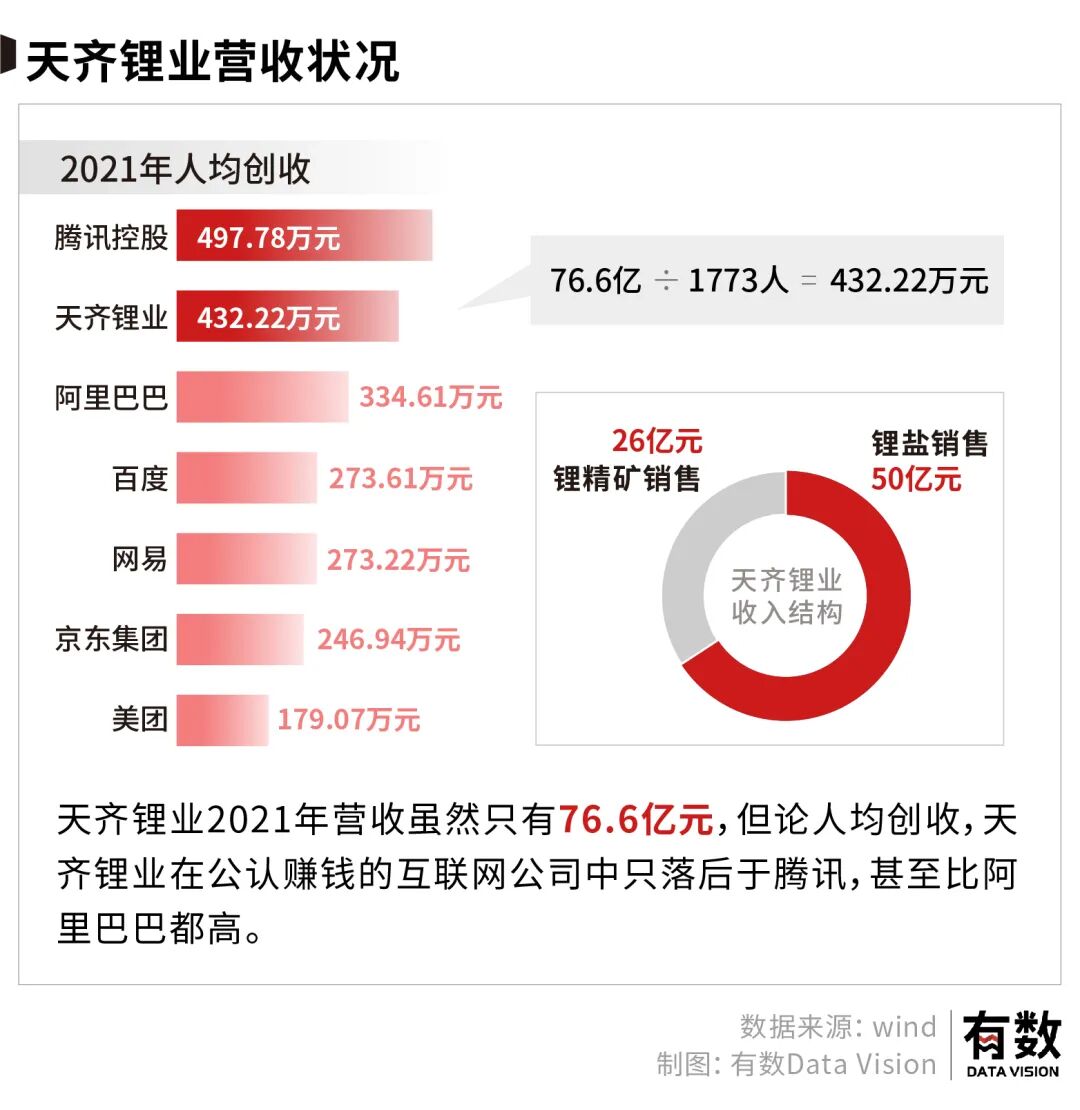 在电动车市场爆发之前,碳酸锂被称为“工业味精”,主要用于玻璃、陶瓷、化工、医药等行业,属于边角料角色,但当电动车市场爆发之后,它摇身一变,成为人见人爱的“白色石油”。上世纪90年代,一吨碳酸锂只能买一部大哥大,2014年,一吨碳酸锂勉强能买一辆五菱面包车,但到今年3月,一吨碳酸锂甚至比一辆宝马5系还贵。在这轮碳酸锂涨价潮中,矿产公司赚得盆满钵满,有的上市公司股价从几分钱暴涨到几块钱,而赚得最多的是智利一家名叫SQM的矿业公司,这家公司的股价在两年多时间内涨了800%。通过多次海外收购,天齐从四川一家小锂盐厂一路跌跌撞撞为全球锂资源巨头。今年第一季度,天齐锂业的净利润达到39亿元,比之前十年赚的总和还要多。上半年预盈更是超过了96亿元,在整个A股预计也能排进前2%。2021年,天齐锂业的锂盐产线(主要是碳酸锂)接近满产,营收达到50亿元,多开采的锂矿直接销售也带来了26亿元的收入。如果将这些收入平摊到天齐锂业1773个员工头上,人均创收甚至比阿里巴巴还高。