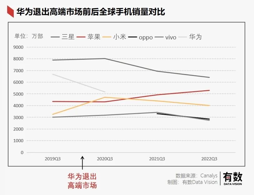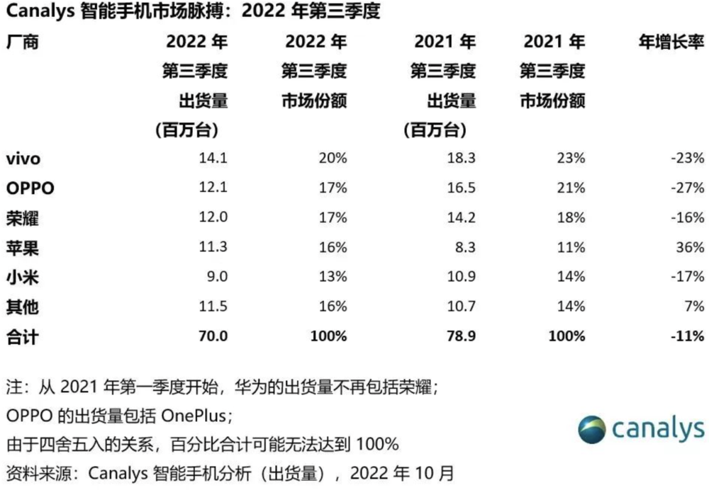 最近三年间,全球手机总销量下滑超过5400万部。其中,三星与2019年的巅峰相比下滑了19%,oppo和vivo的出货量与去年同期相比,也分别下降460万部和680部;小米Q3售出4010万部,对比两年前少卖700万部;唯独苹果两年间销量上涨近1000万部。