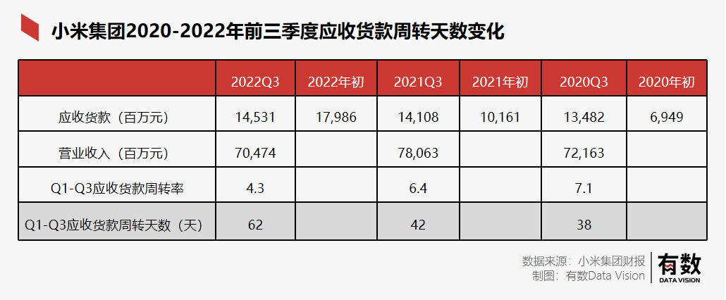 与去年同期相比,小米的手机营收下滑了11%,但成品手机库存增长了15%。此外,其应收账款的时间也持续拉长:从2020年Q3的38天,拉长到21年的42天,再到今年的62天。