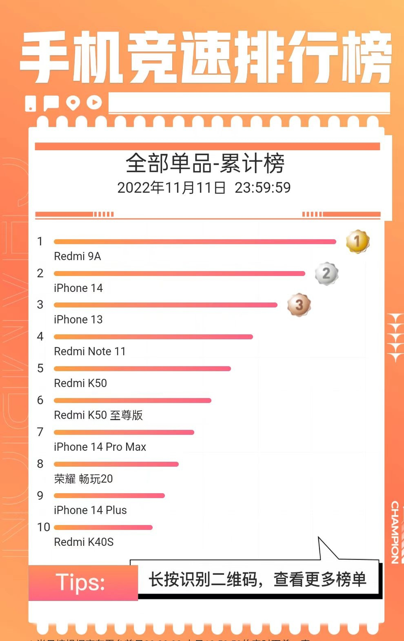 双十一当晚,小米的Redmi 9A力压iPhone 14、iPhone 13雄踞京东手机竞速榜榜首。这是一款价位在600元上下,2020年上市的老手机。同样上榜的Redmi Note11和Redmi K40S也均于去年发布,也都是一两千元的价位。