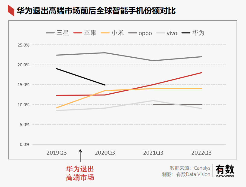 从市场份额的变化来看,华为成为others之后,国产安卓品牌们的确一个能打的都没有:2019年Q3至2022年Q3,三星在全球的份额一直保持在22%左右;Oppo和vivo则分别稳定在10%和9%的份额上;而小米由9.2%跃升至13.5%后,近两年都在此水平线上徘徊。