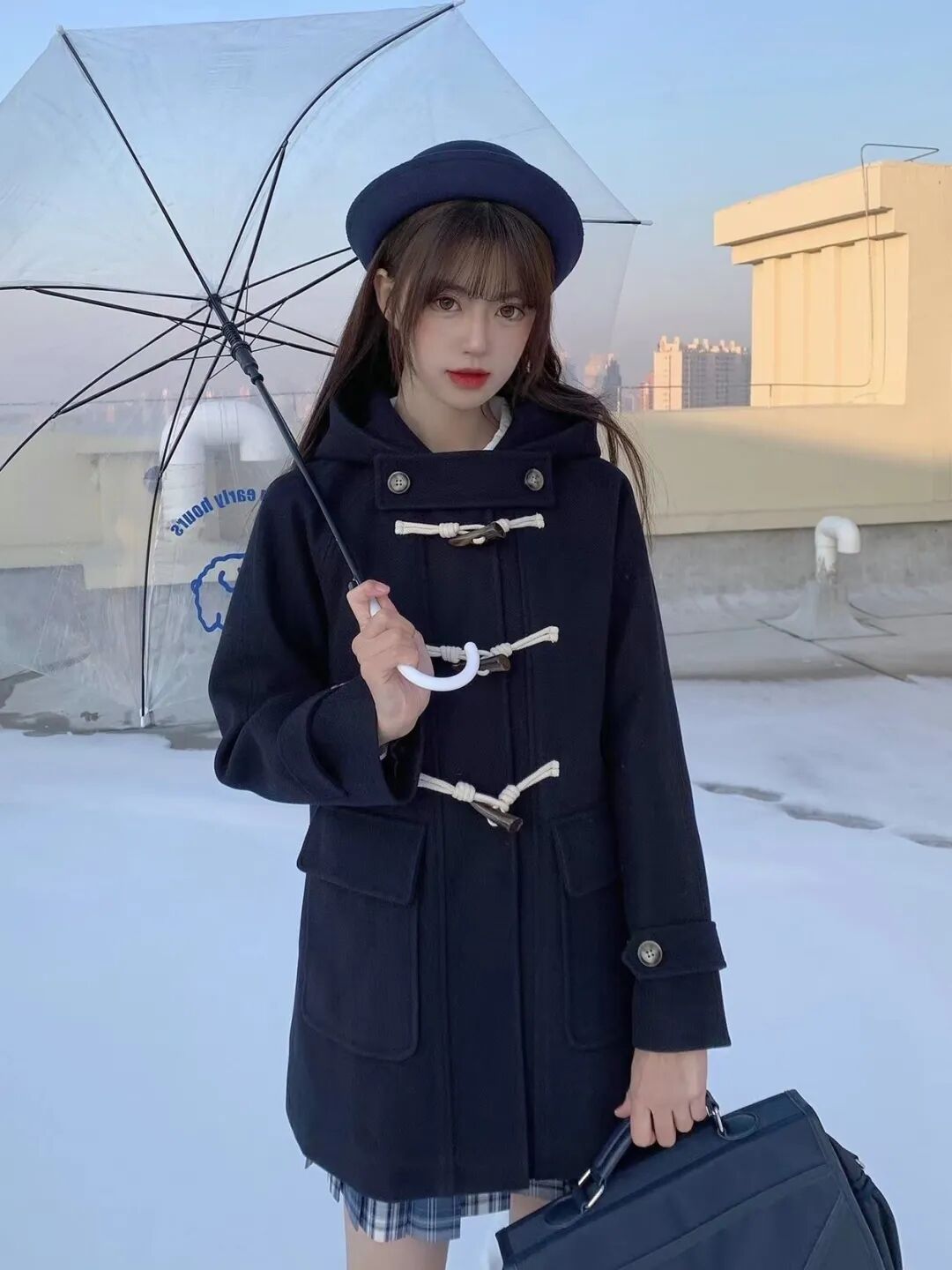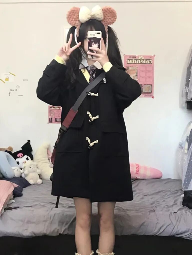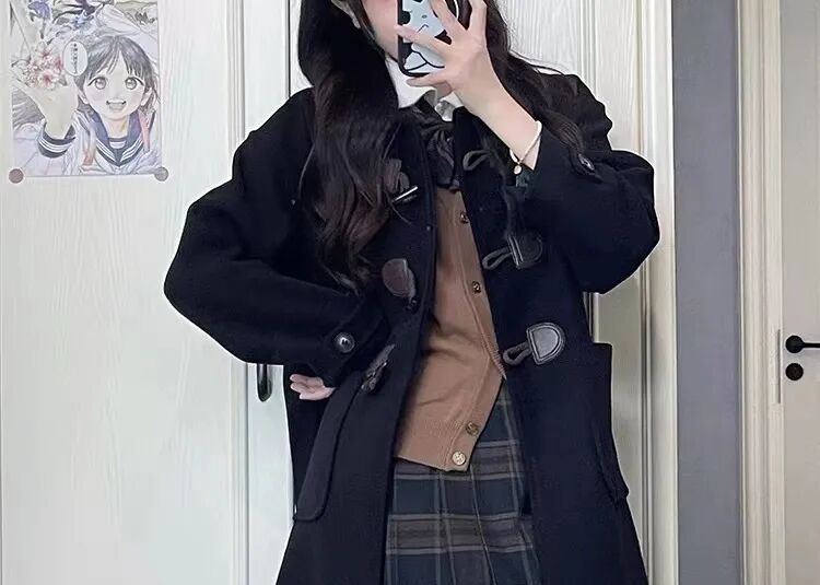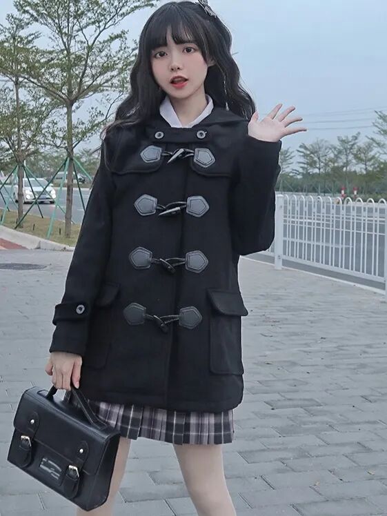 牛角扣大衣,最大的特点就是衣襟处增加了“牛角扣”的装饰,也因为这样一个设计,才让原本单调的大衣瞬间提升了时髦度。
