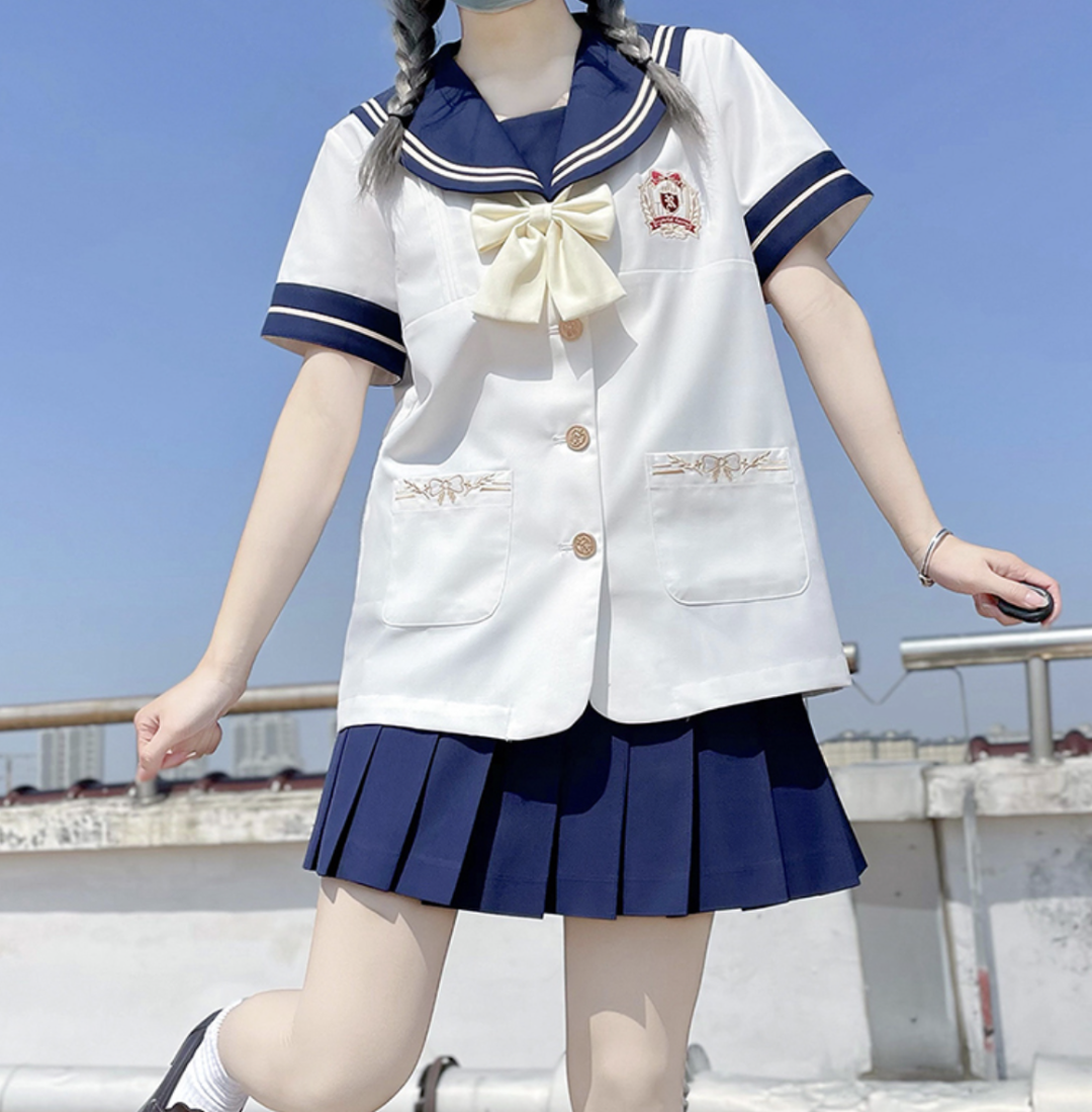 这款很适合预算不多的宝贝哦。有分长短袖,全套包括上衣、裙子和领结。