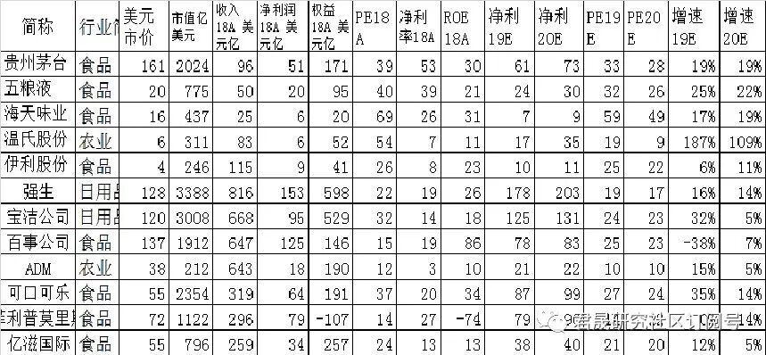 必选消费部门A股前5大市值公司与世界500强有盈利预测数据的必选消费公司估值可以类比,500强必选消费平均估值19/20年PE22/20倍(剔除农业股ADM)。以相似19/20年利润增速可类比日用品的强生19/17x和食品的可口可乐27/24x,茅台和海天合理估值27/23x,目标市值1670亿(-17%)和200亿美元(-53%)。