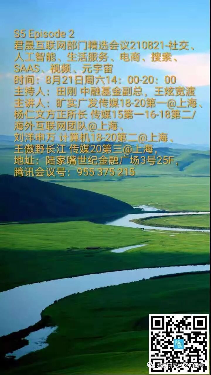 S5 Episode 2 君晟互联网部门精选会议210821六:955 375 215,田刚中融基金副总、王炫宽渡资产,旷实广发传媒、杨仁文方正所长传媒、刘洋申万计算机、王傲野长江传媒。