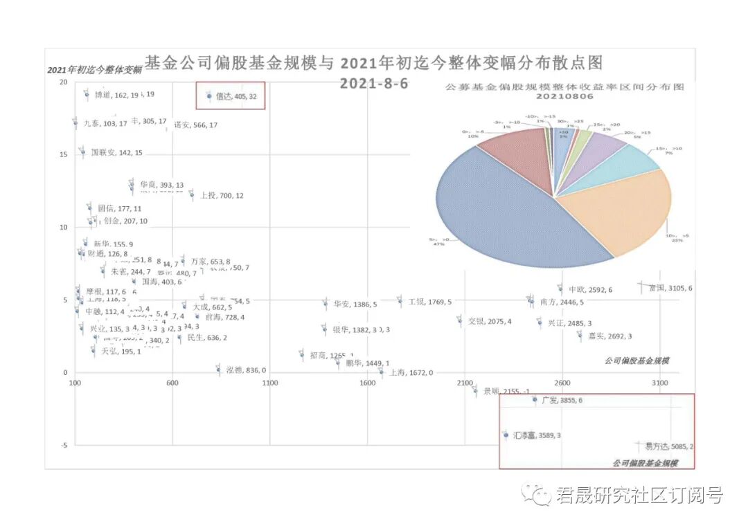 六、科技创新为主导的行业配置是2021年取得领先的核心投资策略:二季度末规模前100位基金经理2021年初迄今整体变幅:65%的基金经理位于-5%到10%区间,只有5位超过30%、10位超过20%。全国基金公司偏股基金规模2021年初迄今整体变幅:80%的基金公司位于-5%到10%区间,只有3%公司超过30%、6%公司超过20%。2021年与2020年机构投资者投资策略最大的差异是行业配置极端重要,2020年抓住全市场细分行业龙头的茅指数策略即可排名靠前。君晟提倡以科技创新为主导的社会责任投资价值观,重申中美全球国力博弈的主战场是科技创新,低碳与互联网都是可长线价值投资的广义科技创新主力部门。科技创新部门范围较宽,包括且不限于新能源技术、智能制造、信息技术、医药生物工程技术、国防航空航天、化工与金属新材料、数字经济、半导体、安可软硬件、消费电子等各个以科技创新为核心发展动力的经济部门。