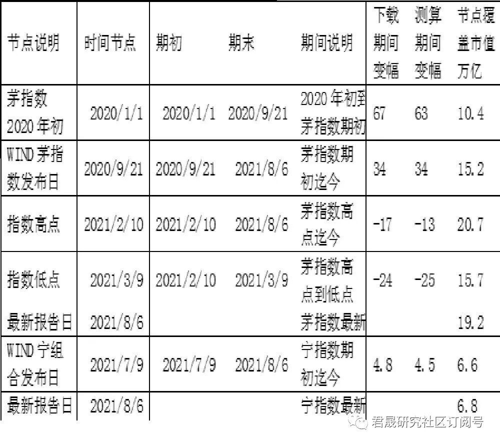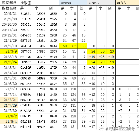 期间变幅:茅发布前期期间变幅67%、茅指数期初2020年9月21日迄今34%、茅指数高点2月10日迄今-17%、茅指数高点2月10日到低点3月9日-24%。宁指数期初7月9日迄今8月6日变幅4.8%。