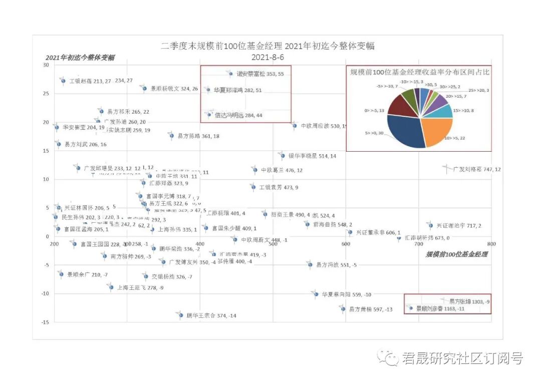 1、二季度末规模前100位基金经理2021年初迄今整体变幅:65%的基金经理位于-5%到10%区间,只有5位超过30%、10位超过20%。全国基金公司偏股基金规模2021年初迄今整体变幅:80%的基金公司位于-5%到10%区间,只有3%公司超过30%、6%公司超过20%。