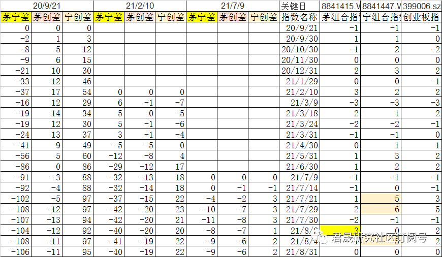 第三起点迄今的三个指数收益率累计差额,茅宁差已经小于-9%,茅创差小于-6%,宁创差大于2%。