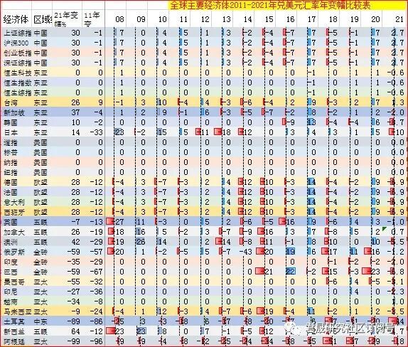假设一家主权基金或美国全球配置机构投资者,在年初对 24个全球主要经济体32个股指做等额配置,在计算年收益率时应在被投资经济体股指本币变幅上叠加本币兑美元汇率年变幅才是可比较排名的美元计价股指年变幅。中国主要股指包括上证综指、沪深300、创业板指、深证综指399106.SZ四个股指,香港主要股指包括恒生科技、恒生指数、恒生综合指数HSCI.HI三个股指,上证综指和深证综指、恒生综指是交易所全市场指数。美国主要股指包括道指、标普500、纳指、纽交所综合指数四个股指,其中纳指和纽交所综合指数是交易所全市场指数。