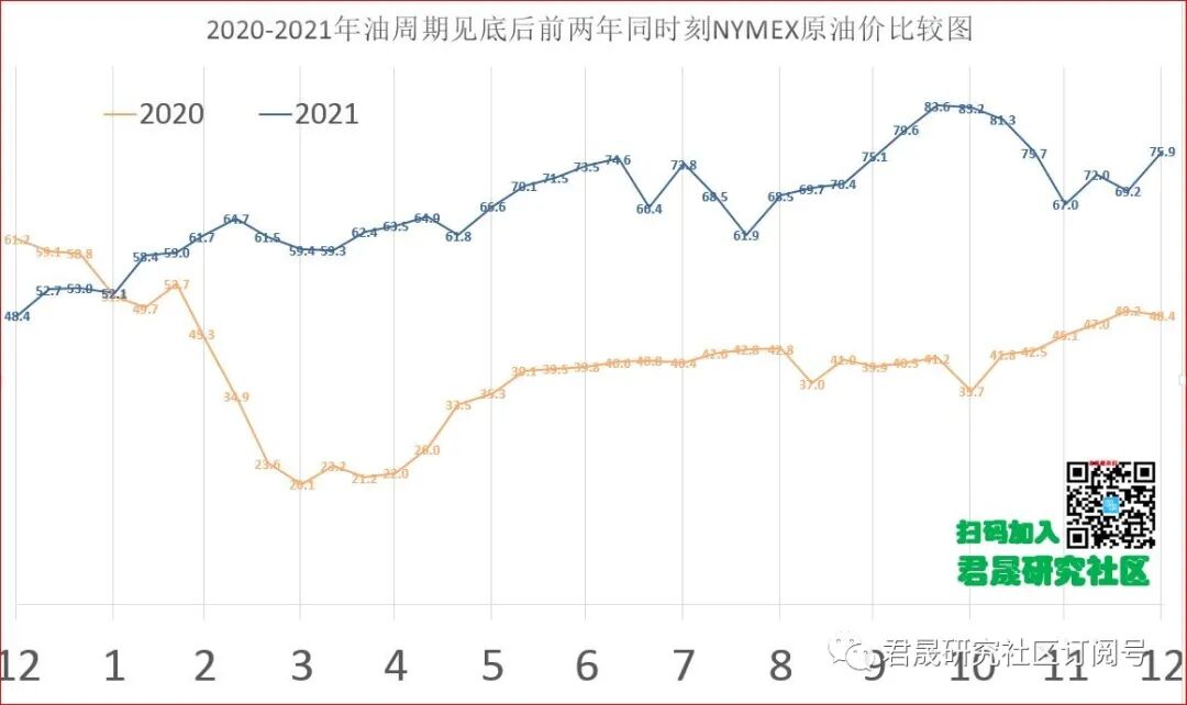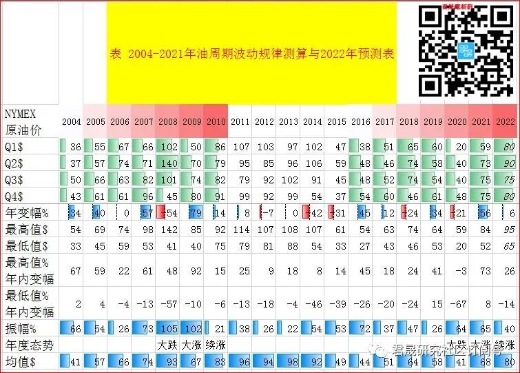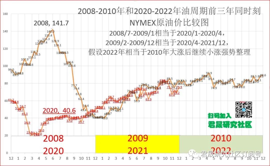 三.2、中国通胀分析之油价:油价继续大幅上涨还是涨幅收敛?君晟预测2022年NYMEX油价从76美元上涨5%年末目标价80美元、波动区间65-95美元、 年度态势类似于2009年大涨后继续小涨强势整理的2010年冲高回落态势。2022年主要经济体石油需求复苏还有待观察,油价还不宜看空,但全球原油供给按计划恢复性增长,因此2022年油价上涨幅度有限。