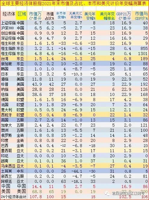 2021年末24个经济体合计不重复市值107.8万亿美元、年变幅15,中国合计市值11.4万亿美元占比11%、年变幅5%,美国合计市值67.6万亿美元占比65%、年变幅19%.。