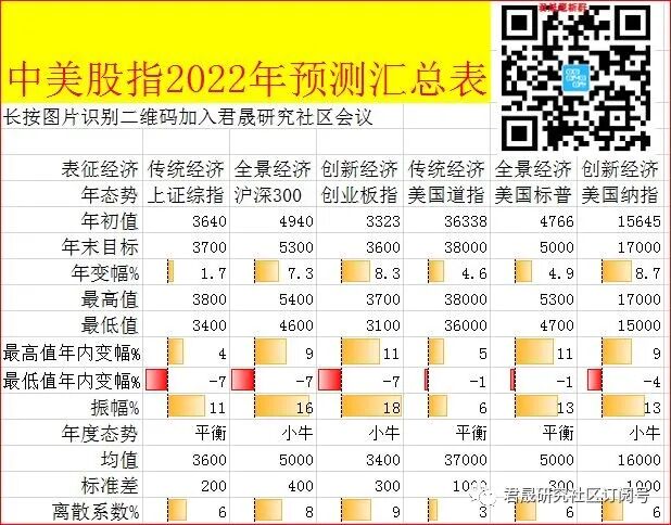 七、中美资本市场是振幅加大还是维持平稳?稳!2022年中美两国金融市场暂无系统性风险、难以大起大落,2022年美股肯定不会崩、美国经济增速2022年预计远高于潜在增速1.7%运行,中国宏观政策稳中趋暖、经济回归5.5%潜在增速高质量中速运行,中美政治大年就是金融市场平稳年。君晟预测中美主要股指2022年波动区间与年末目标:上证综指围绕年线3600点上下200点3400-3800点区间波动的目标3700点变幅2%的平衡市,沪深300围绕5000点上下400点4600-5400点区间向上宽幅震荡的目标5300点涨幅7%的弱小牛市,创业板指围绕3400点上下300点3100-3700点区间向上宽幅震荡的目标3500点涨幅8%的弱小牛市。美国道指是围绕37000点上下1000点38000-36000点区间向上宽幅震荡的强平衡市、年末目标38000点年变幅5%,美国标普是围绕5000点上下300点5300-4700点区间向上宽幅震荡的强平衡市、年末目标5000点年变幅5%,美国纳指是围绕16000点上下1000点17000-15000点区间向上宽幅震荡的小牛市、年末目标17000点年变幅9%。高盛《2022市场展望》2021年12月16日预测沪深300年末目标5500点年变幅13%,MSCI中国指数年变幅16%,预测离岸互联网指数目标升幅30%。瑞银《2022年度展望》2021年11月末预测MSCI中国指数年变幅大于10%。君晟预测沪深300变幅低于高盛与瑞银的预测目标。