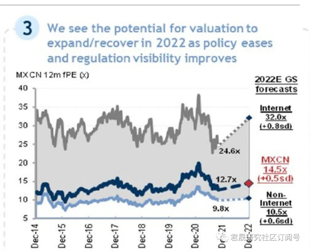 高盛《2022市场展望》2021年12月16日预测沪深300年末目标5500点变幅13%, MSCI中国指数 MXCN 市盈率从12.7倍上行到14.5倍、目标105、年变幅为16%,中国互联网指数从24.6倍上行目标32倍、年变幅为30%。瑞银《2022年度展望》2021年11月末预测MSCI中国指数年变幅大于10%。君晟预测沪深300变幅低于高盛与瑞银的预测目标。