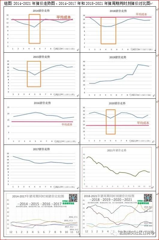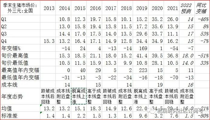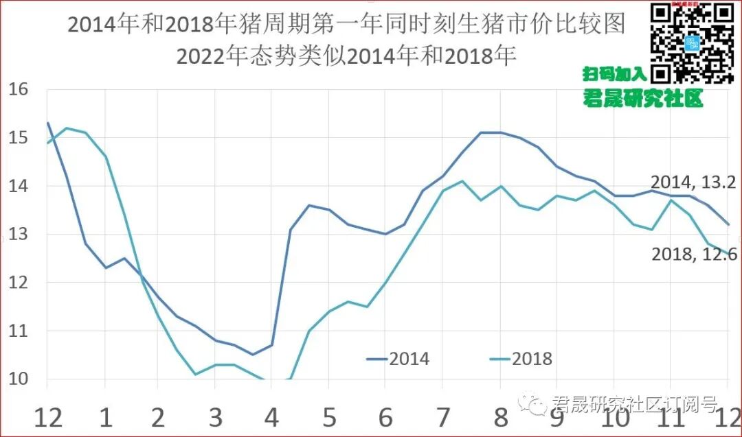 三、1中国通胀分析之猪价:2022年猪价能上升推动CPI通胀吗?君晟预测2022年生猪价年末目标价15元年变幅-7%、波动区间14-18元、均值与标准差16.0±1.5元、年度态势是类似于2014年和2018年猪周期第一年的成本线附近波动。
