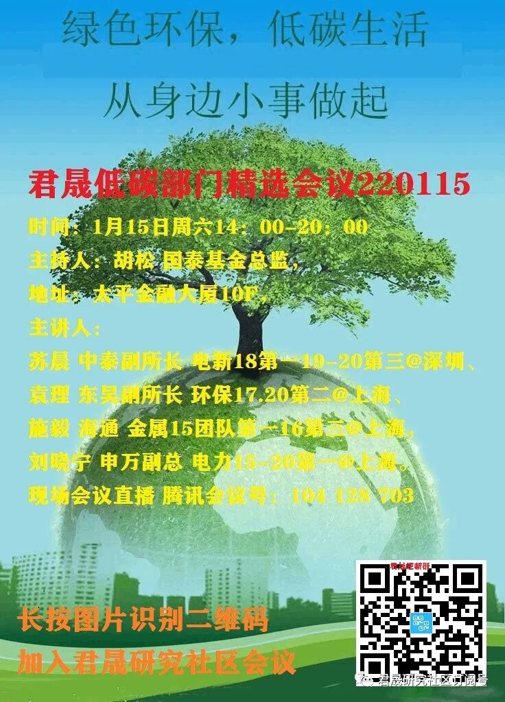 S6 Episode 1 君晟低碳部门精选会议220115 新能源:设备、材料、减碳、绿电运营,周六:104 128 703,主持人:胡松国泰基金总监,主讲人:苏晨 中泰副所长电新18第一19-21第三@深圳、王鹤涛 长江副所长金属12-21第一@上海、袁理 东吴副所长环保17.20-21第二@上海、刘晓宁 申万副总电力15-21第一@上海、赵智勇长江机械21第一@上海。