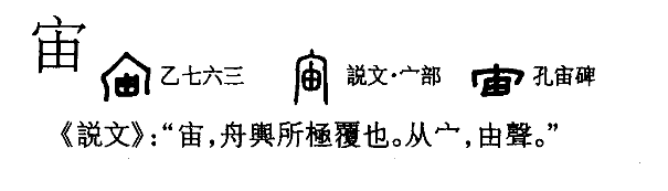 (說明:講“宙”之前,要先講一下相關字。漢字精微某些條目中有“相關字”一項,往往是常用的,或者與要解的字關係極密切,而《千字文》又沒有收的。一般將相關字放在正文的後面,但是本篇不同,如果不先弄明白相關字,“宙”就太難講明白。本篇中還重點講解“指事字”和“會意字”兩種造字方法。)