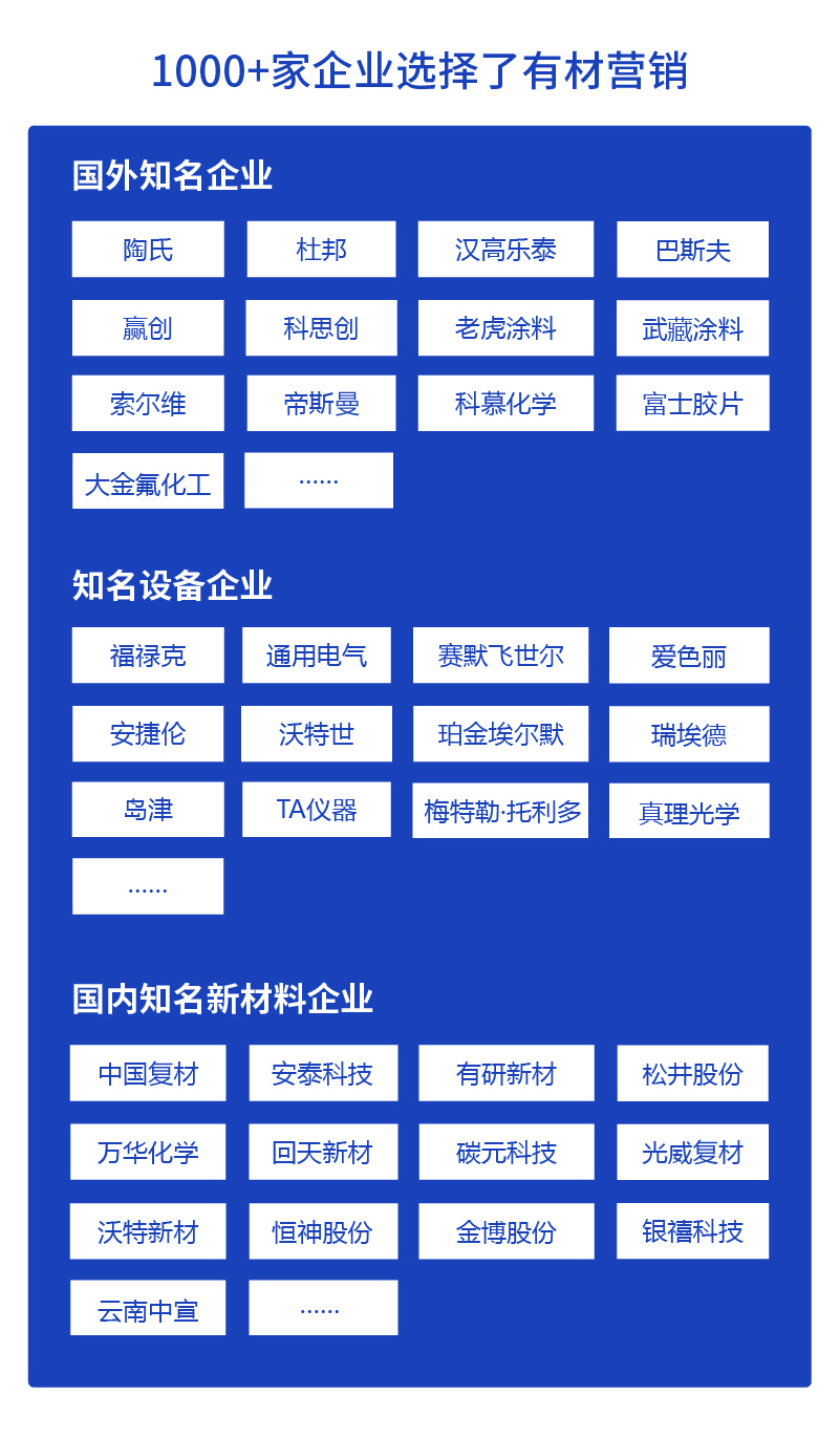 新材料在线®6年打造新材料行业一站式服务平台,依托海量制造企业、终端企业资源,让营销内容直达目标客户,助力企业实现低成本精准获客。