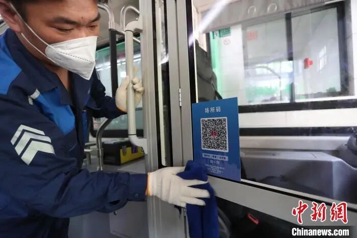每辆公交车司机位置的隔离门均被贴上了车辆的场所码。未来,乘客上车后需扫描车辆场所码,方便追溯查验。