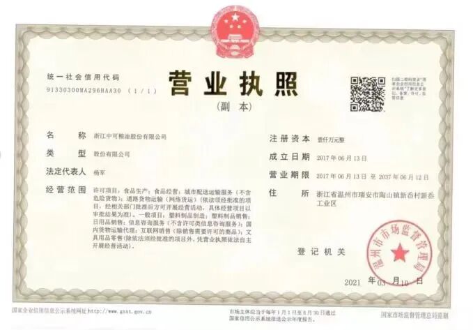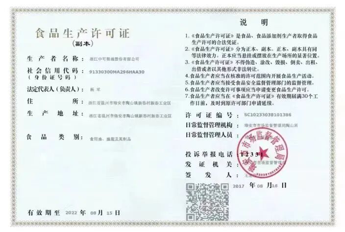 经区市场监管部门对实物和企业营业执照、食品生产许可证等相关资质的核查,主食包内“锐宝丰”鲜胚玉米油(非转基因)生产商浙江中可粮油股份有限公司具备食用油、油脂及其制品食品生产许可,注册资本1000万元。