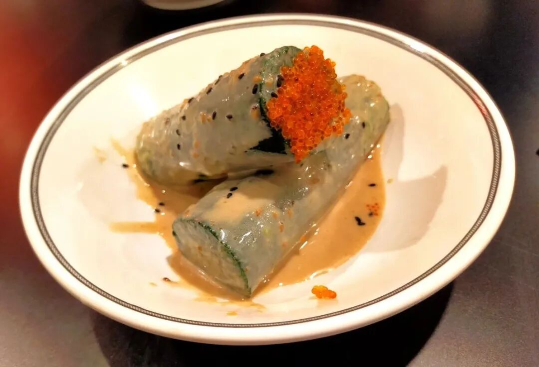 小编对这道造型与名字都十分独特的菠菜也很感兴趣。菠菜被做成了圆柱体,顶端还用了鱼籽做点缀,撒上芝麻酱与黑芝麻,赏心悦目的同时也十分爽口。