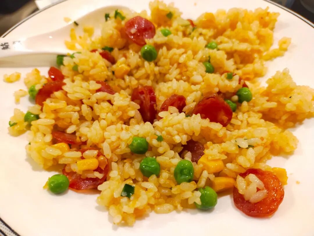 第一眼看上去跟普通的日式炒粉没啥区别,但一吃味道还真是特别。咸蛋黄的鲜香包裹着每一粒米饭,还能吃到香肠与玉米的香甜。