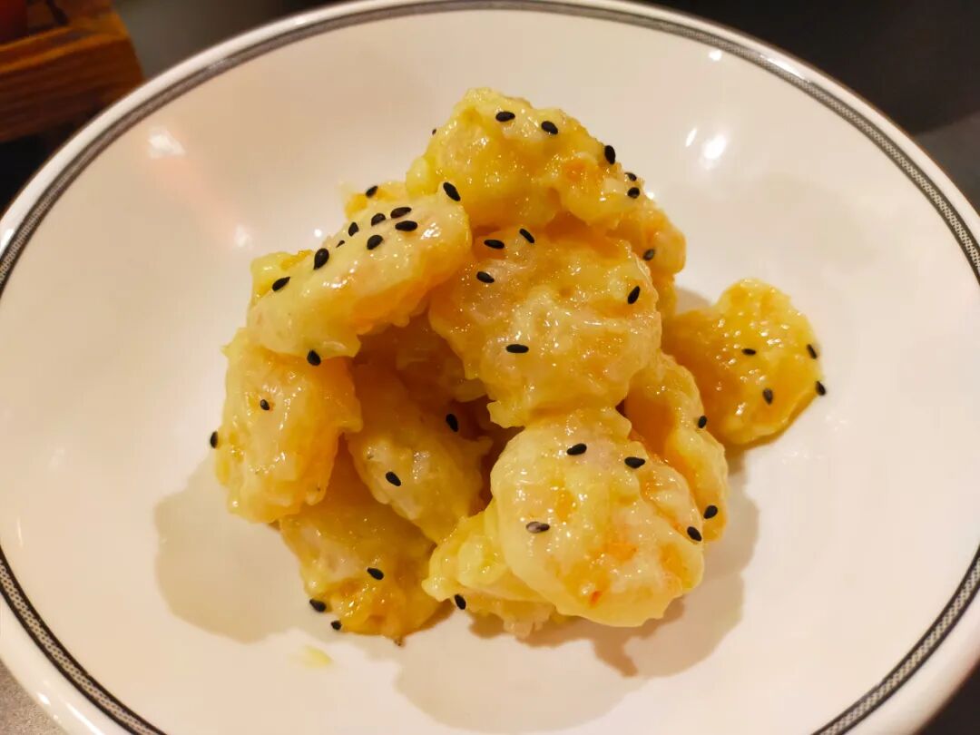 芥末和虾的混搭,出乎意料的和谐。虾仁Q弹,外面包裹的酱料,吃起来像蛋黄酱和芥末酱混合而成,香甜中窜出芥末的辛辣,别具一番风味。